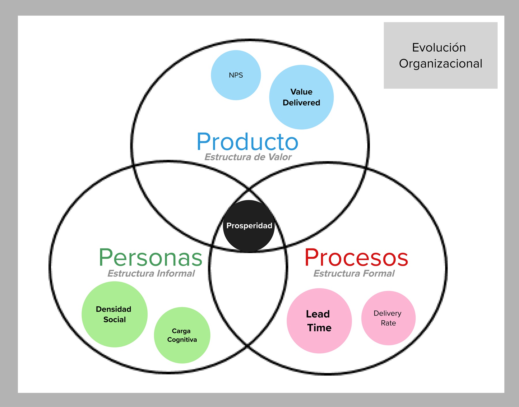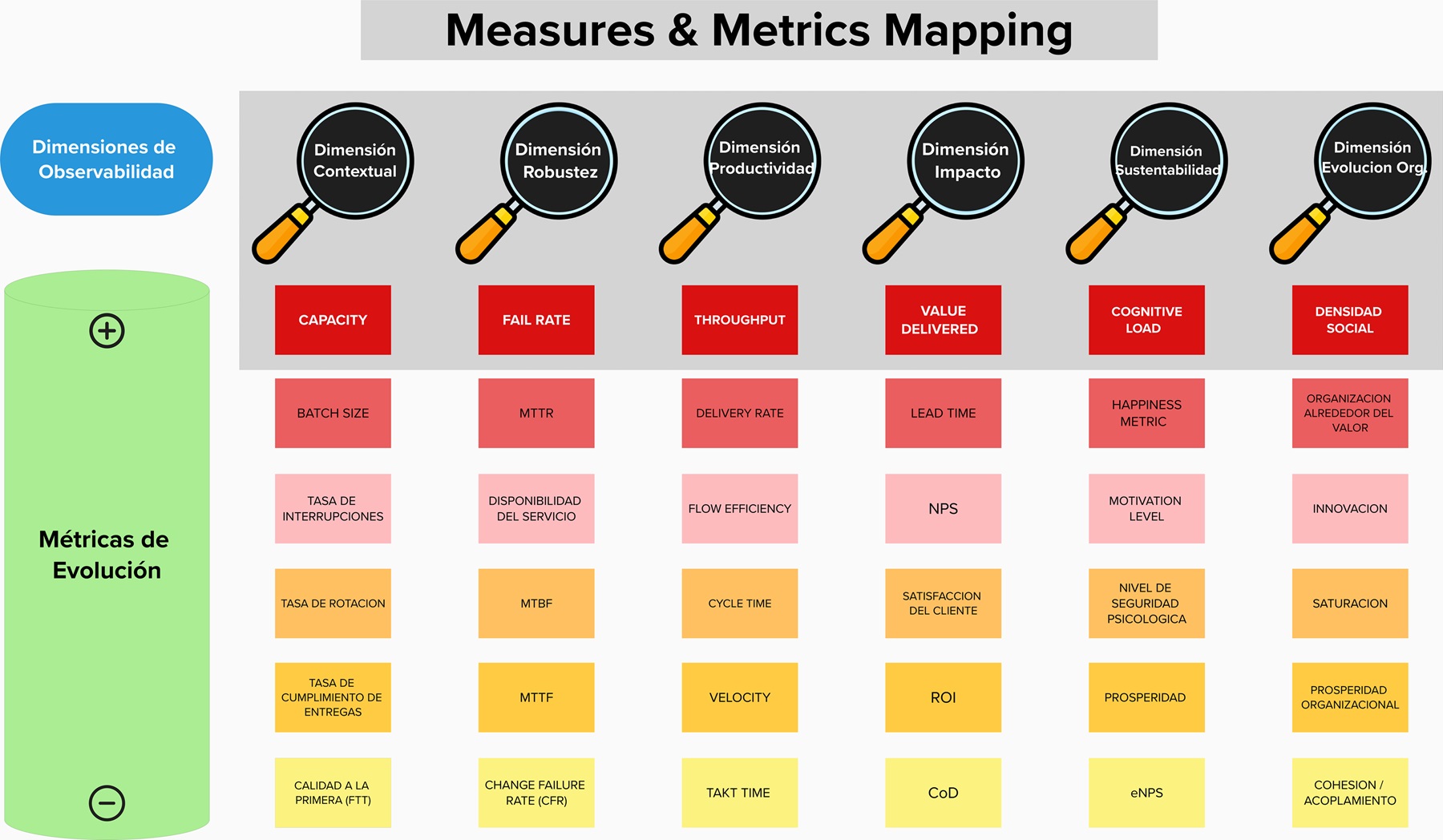 - Dimensión de la Evolución Organizacional (Evolution Metrics): nos habla sobre la capacidad de la organización para adaptarse rápidamente a los cambios del mercado de manera interna y externa.