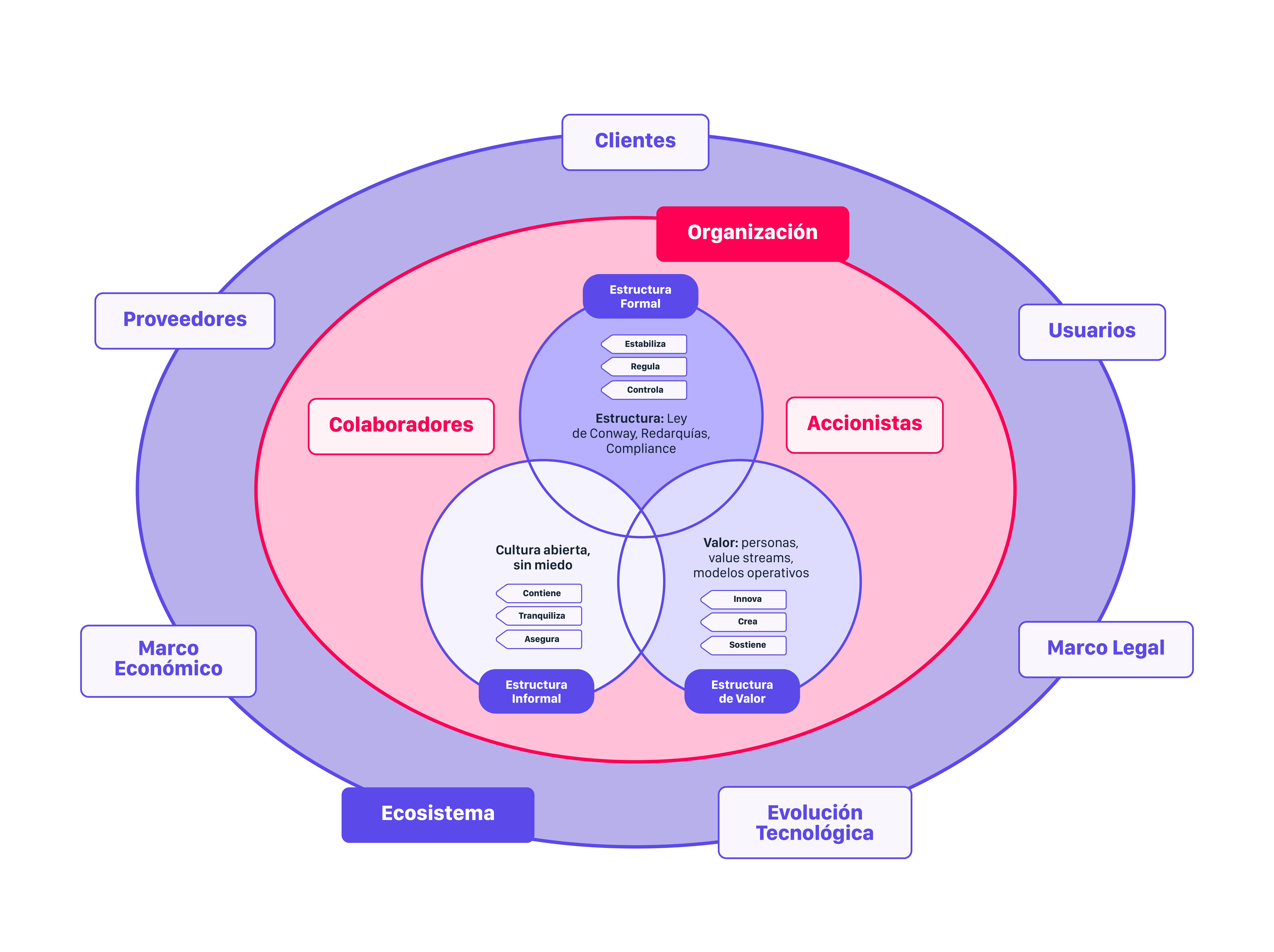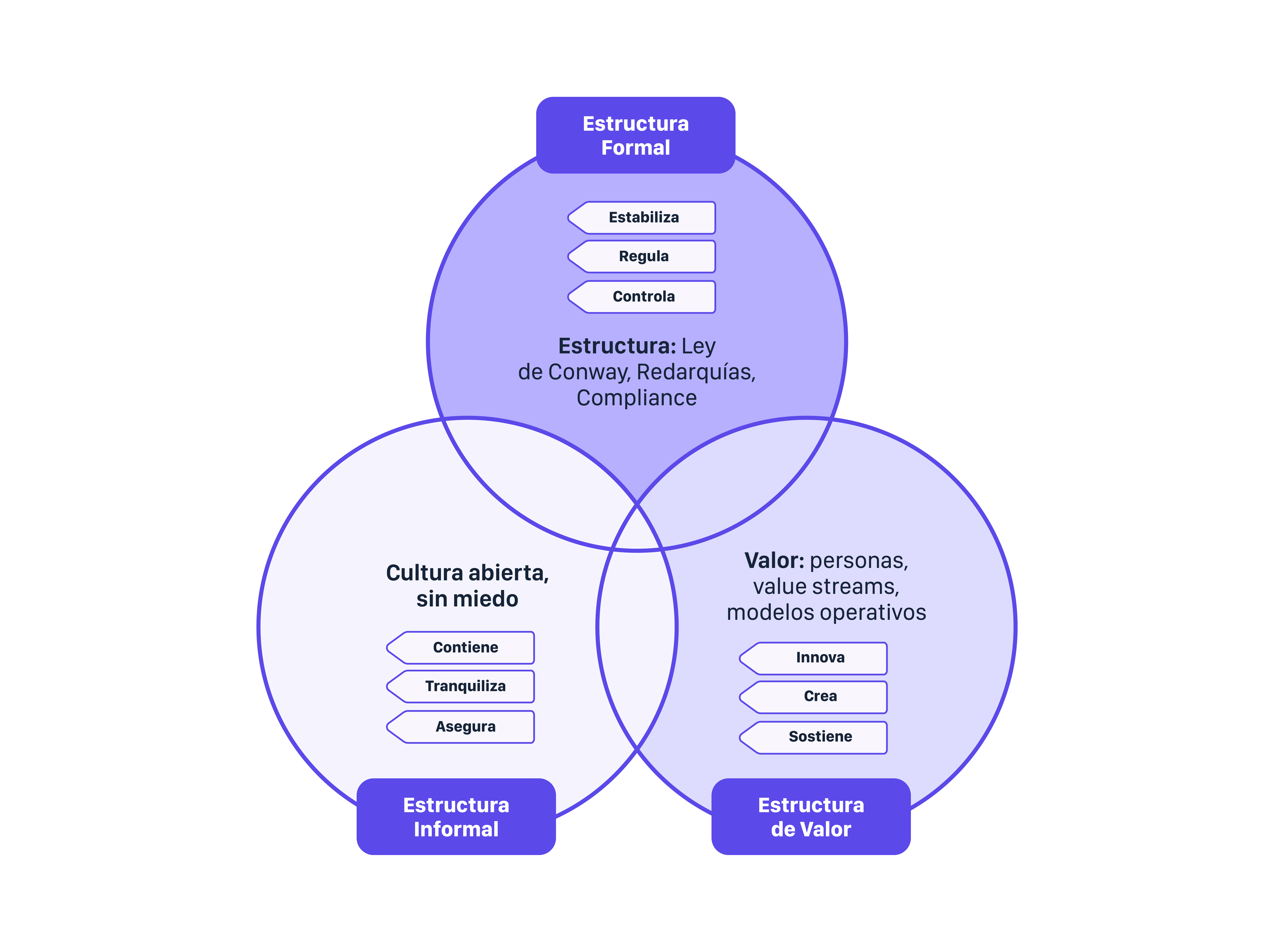 Para crear la capacidad orgánica en las organizaciones de adaptarse continuamente, debemos activar cambios en las estructuras que adoptan y sustentan a la Evolución Organizacional: Estructura, Cultura y Valor.